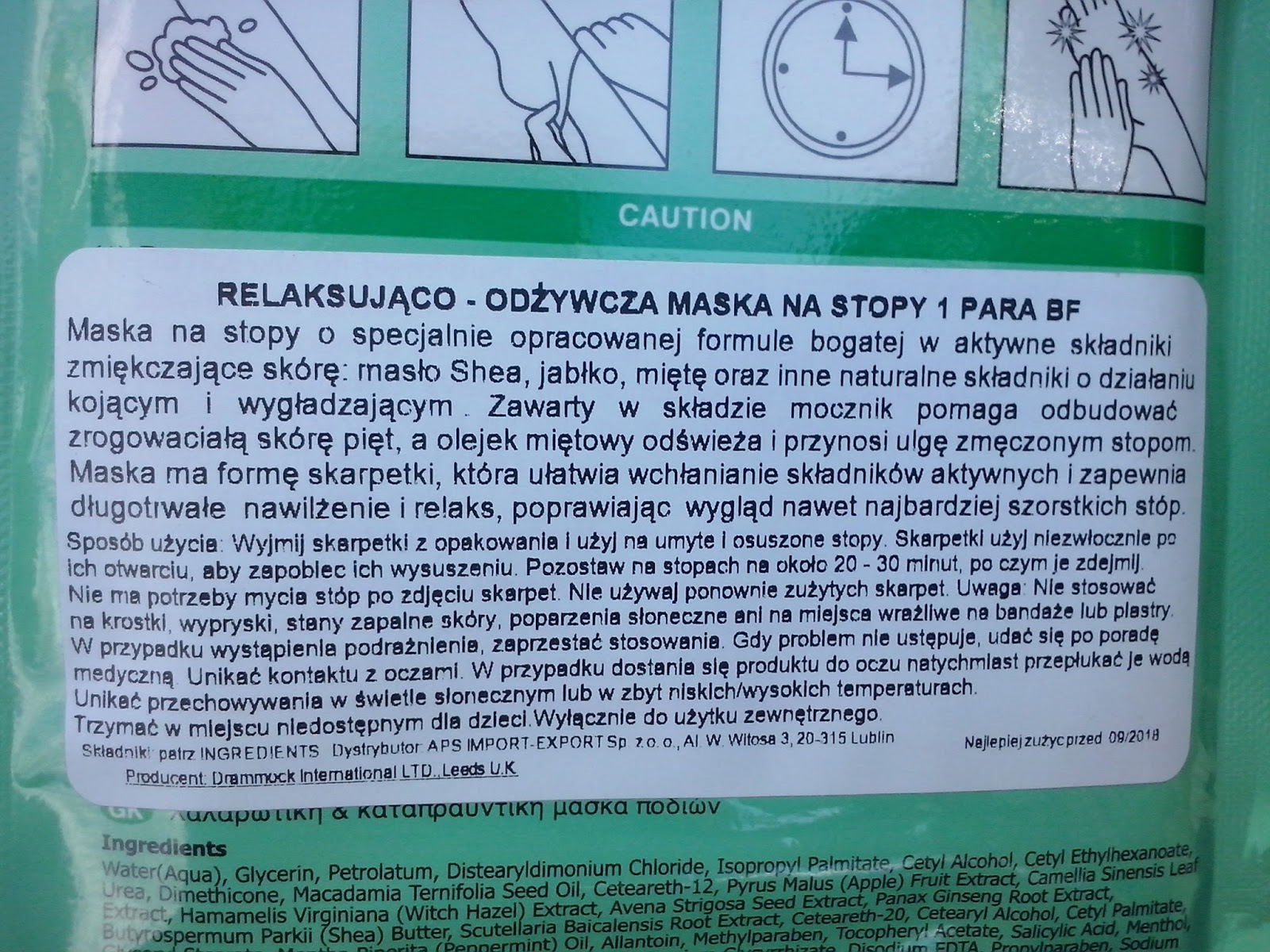 Była to moja pierwsza maska do stóp w formie skarpetek, tym też moja ciekawość była większa. Specjalnie wybrałam dla niej taki wieczór, żeby poświęcić jej czas, bo powinno się ja trzymać na stopach około 20-30 minut. Maska przeznaczona jest do stóp, a dzięki bogatemu składowi: masło shea, jabłko, mięta ma zapewnić im wygładzenie i długotrwałe nawilżenie.